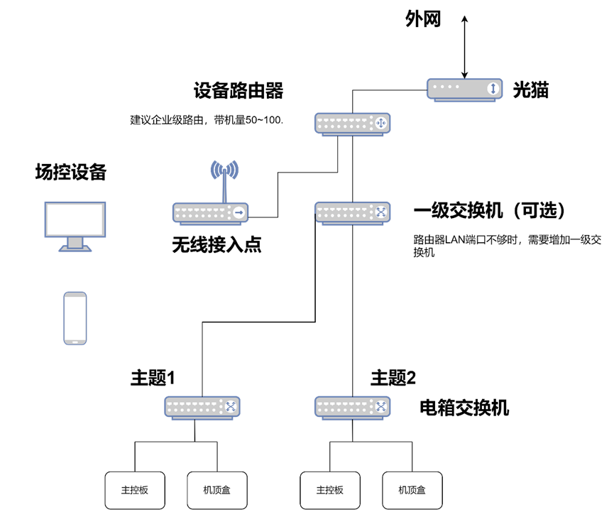 独立的用于设备的路由器,为了保证稳定和安全,该路由器不能与玩家或监控设备共用。