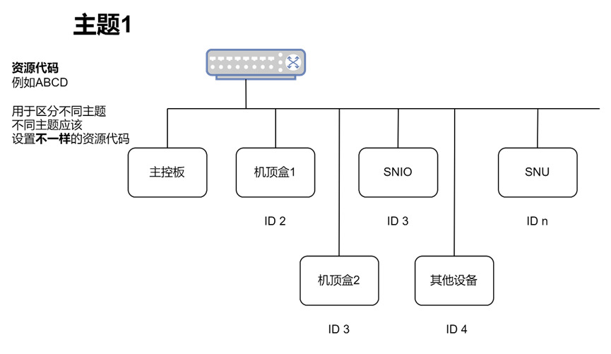 资源代码 用于标明设备与主题的对应关系。相同资源代码的设备,属于同一个主题。可以通过配置文件(机顶盒)、设置界面(SNU、SNIO、SNA)等方式,设置在相关设备的资源代码。