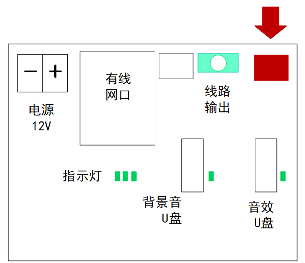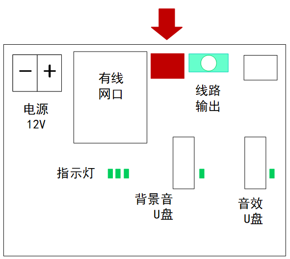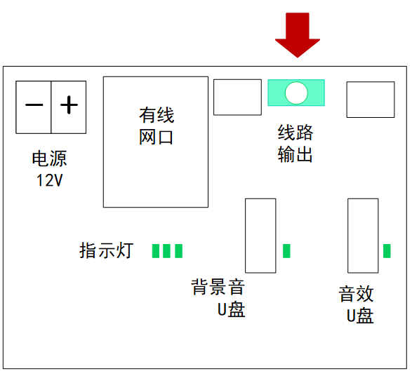 线路输出是背景音和音效通道混音之后,供给功放机的输入端。以3.5mm耳机接口形式,如下图红色区域所示: