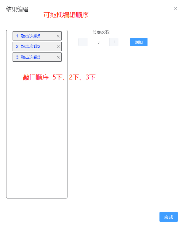 输入端口:节奏组列表,编辑答案对应的节奏;节奏组编辑的界面,可以通过拖拽的方式排序
