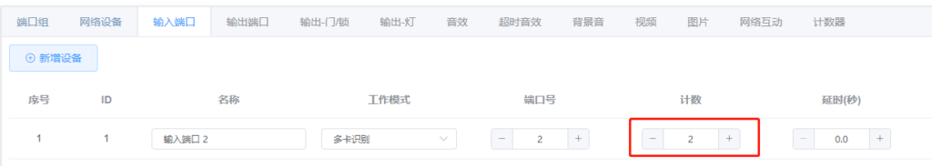 每个多卡识别模式的输入端口,都可以与一个计数器设备绑定。绑定后,刷卡的ID会更新到计数器的数值中